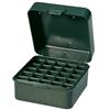Dual Gauge Shotshell Case. The S25D holds 25 shotshells in the down position. The removable tray is for 20 gauge and can be discarded. With the tray out, the box it will hold up to 3" 12 and 16 gauge shells. 2 ¾" fired shells fit back in the box, important, if you're reloading. The latch has been designed to be opened easily, even with gloves. Available in clear smoke or forest green and has a mechanical hinge.