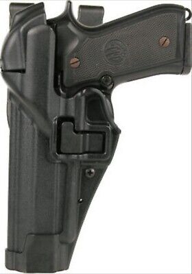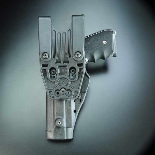 Jacket slot belt loop holster provides retention and speed in a duty style. Officers may wear as part of duty rig or belt-mounted holster. Full-length body protects rear sights. Reduced gun profile supports a community friendly look. Auto Lock Technology; engages the trigger guard as users holster the pistol.