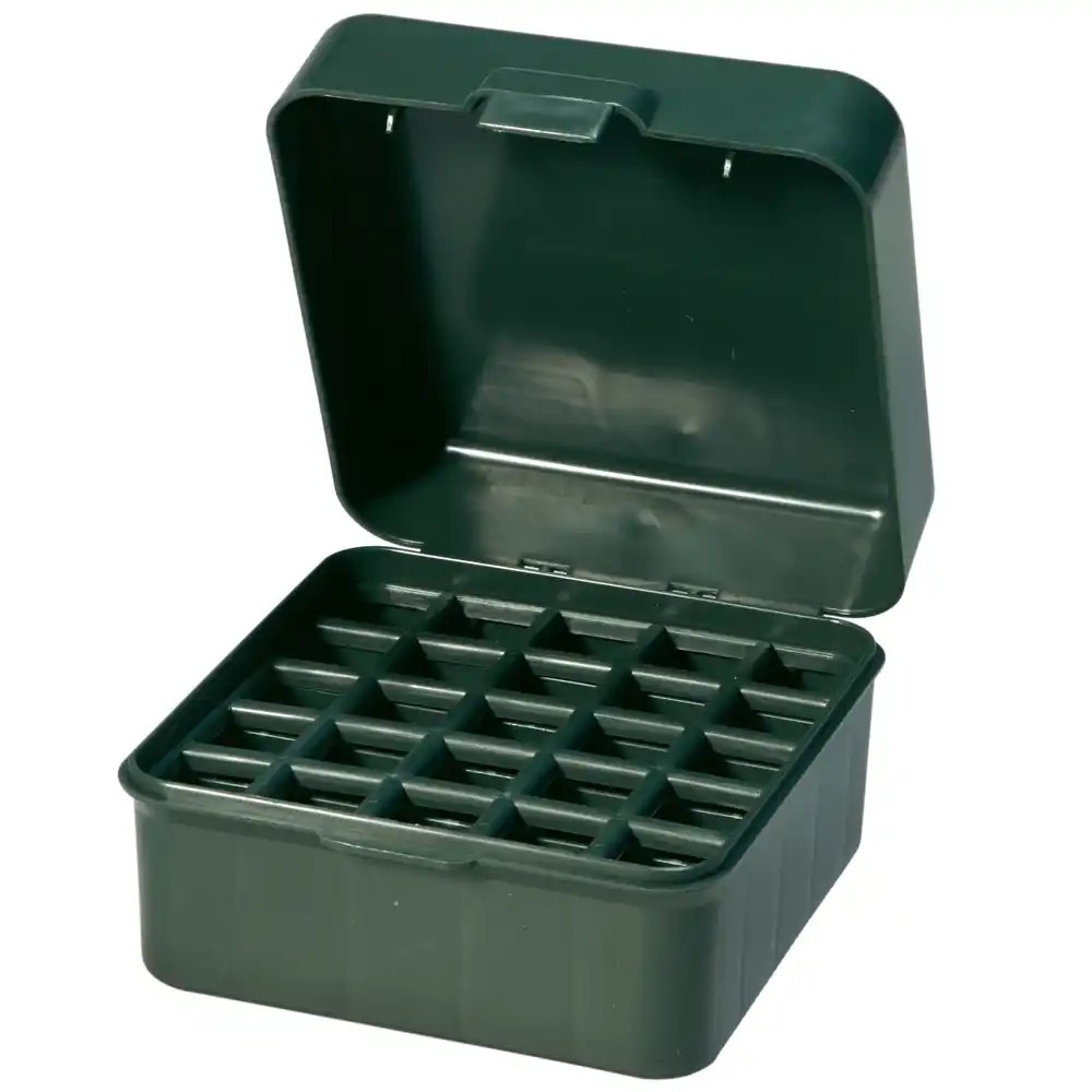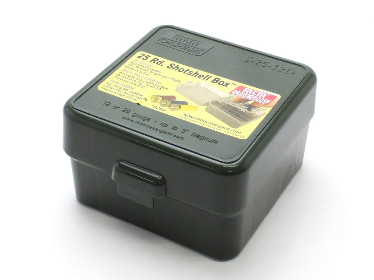 Dual Gauge Shotshell Case. The S25D holds 25 shotshells in the down position. The removable tray is for 20 gauge and can be discarded. With the tray out, the box it will hold up to 3" 12 and 16 gauge shells. 2 ¾" fired shells fit back in the box, important, if you're reloading. The latch has been designed to be opened easily, even with gloves. Available in clear smoke or forest green and has a mechanical hinge.