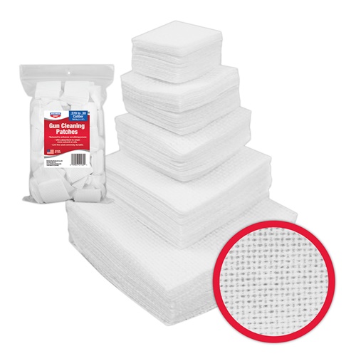 FITS: .22 TO .25 CALIBER FIREARMS DURABLE CROSS WEAVE PATTERN LINT-FREE HIGHLY ABSORBENT MATERIAL DETAILS BIRCHWOOD CASEY'S GUN CLEANING PATCHES OFFER BETTER FEATURES, AND A BETTER VALUE, ALL IN AN AMERICAN MADE PRODUCT. OUR PATCHES FEATURE A DURABLE CROSS WEAVE PATTERN THAT ENHANCES THE PATCHES SCRUBBING POWER AND IS ENTIRELY LINT FREE. THE HIGHLY ABSORBENT MATERIAL HOLDS MORE OIL FOR BETTER COVERAGE AND MORE SOLVENT FOR THOSE EXTRA DIRTY CLEAN UP JOBS.