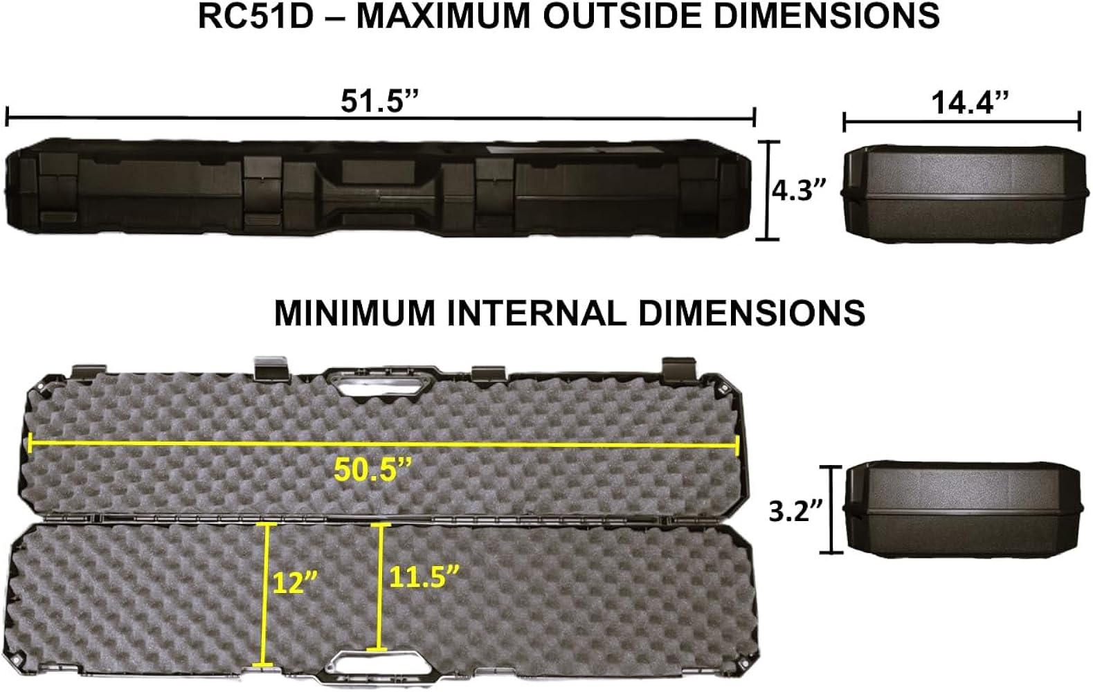 กล่องพลาสติกแข็งที่ออกแบบมาเพื่อบรรจุปืนยาวติดกล้องสองกระบอกเพื่อการขนส่งที่ปลอดภัย ผลิตในสหรัฐอเมริกาจากพลาสติกทนแรงกระแทกคุณภาพสูง ด้านในกรุฟองน้ำรังไข่ ขนาดภายใน 50.5”(128cm) x 11.3”(29cm) x 3.2”(8cm) At handle 11.5"(29cm)