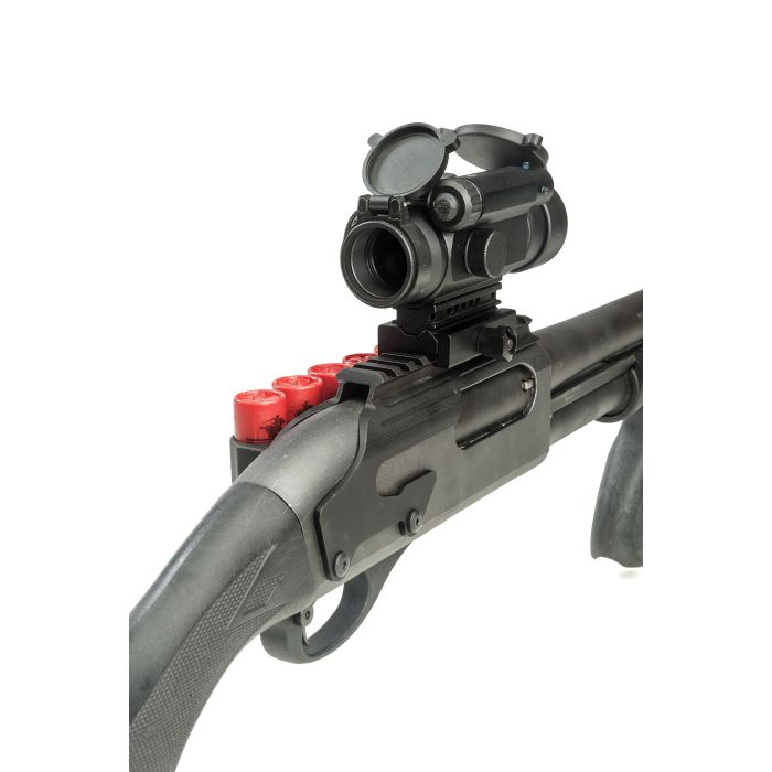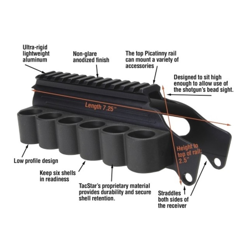 Ultra-rigid, this innovative lightweight aluminum unit straddles both sides of the receiver and is crafted with a non-glare anodized finish. The top Picatinny rail can mount a variety of accessories, yet is designed to sit just high enough to allow continued use of the shotgun's bead sight. Keeping six shells in readiness, the low profile design SideSaddle incorporates TacStar's proprietary material for durability and secure shell retention. Order the Shotgun Rail Mount with Sidesaddle by TacStar today for convenient way to reload. No gunsmithing required! Order today!